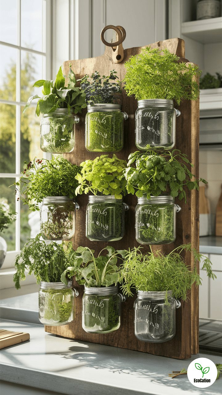 For a stylish and space-saving option, try a vertical herb garden with hanging Mason jars. Secure the jars to a wooden board or metal frame using clamps or wire, and hang the frame on a wall. This setup is perfect for small indoor spaces like kitchens or balconies, and the clear glass jars allow you to see the roots growing, adding an extra element of interest to your garden.